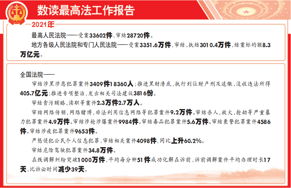 過(guò)去一年,司法前行的印記更加清晰,法治中國(guó)的腳步更加堅(jiān)毅,報(bào)告中的一個(gè)個(gè)案例,傳遞了鮮明的價(jià)值導(dǎo)向,讓法律條文走進(jìn)千家萬(wàn)戶。報(bào)告中的一串串?dāng)?shù)據(jù),勾勒出平安中國(guó)、法治中國(guó)建設(shè)新成效:2021年,最高人民法院受理案件33602件,審結(jié)28720件,制定司法解釋24件,發(fā)布指導(dǎo)性案例31個(gè);地方各級(jí)人民法院和專(zhuān)門(mén)人民法院受理案件3351.6萬(wàn)件,審結(jié)、執(zhí)結(jié)3010.4萬(wàn)件,結(jié)案標(biāo)的額8.3萬(wàn)億元,助推實(shí)現(xiàn)國(guó)家安全、社會(huì)安定、人民安寧。