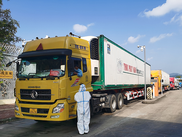 廣西東興出入境邊防檢查站為全力保障口岸貨車及司機(jī)高效、安全、優(yōu)質(zhì)通關(guān),按照閉環(huán)管理要求,全面推行7×24小時(shí)貨物通關(guān)服務(wù),隨到隨檢,全年不休,全力以赴保障疫情防控常態(tài)化條件下中越跨境貿(mào)易順暢通關(guān)。圖為民警對(duì)跨境貨車進(jìn)行檢查。林珉正 攝