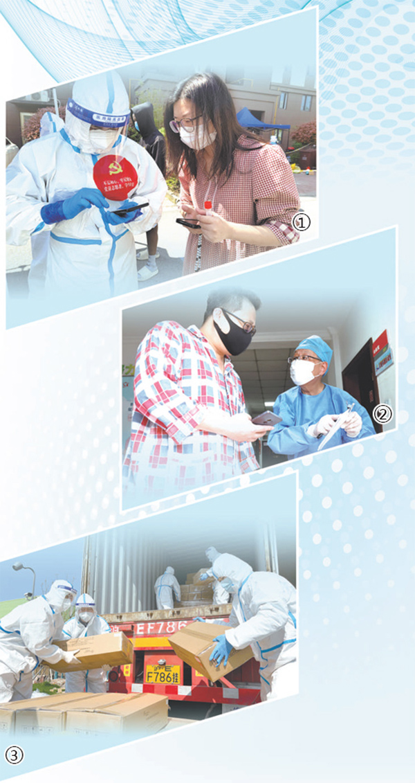 圖①:上海市浦東新區(qū)惠南鎮(zhèn)建欣苑臨時(shí)黨支部黨員(左)在核酸檢測(cè)現(xiàn)場(chǎng)給居民掃碼。方宏生攝(人民視覺(jué))