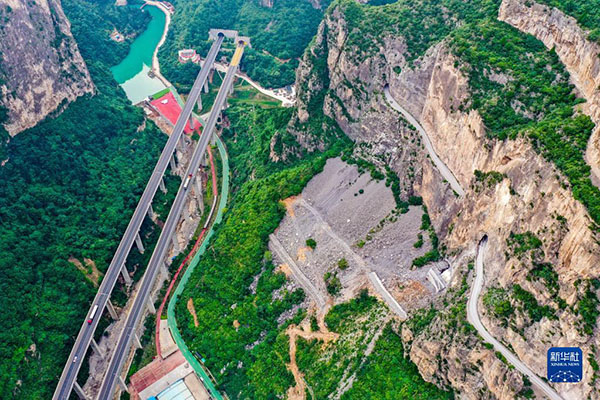 這是通過山西省長(zhǎng)治市平順縣虹梯關(guān)鄉(xiāng)的高速公路(畫面左側(cè)),一旁是過去的“掛壁公路”(畫面右側(cè))(2022年7月5日攝,無人機(jī)照片)。新華社記者 曹陽 攝