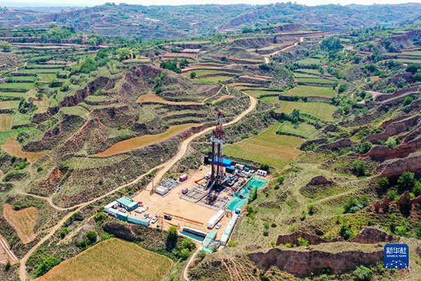 這是在山西省長(zhǎng)治市武鄉(xiāng)縣拍攝的一處煤層氣鉆井現(xiàn)場(chǎng)(無人機(jī)照片,2021年6月22日攝)。新華社記者 曹陽 攝