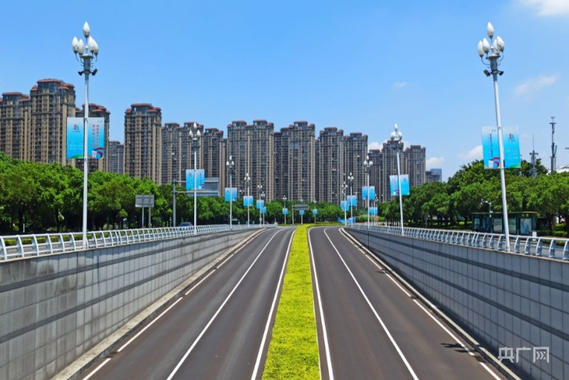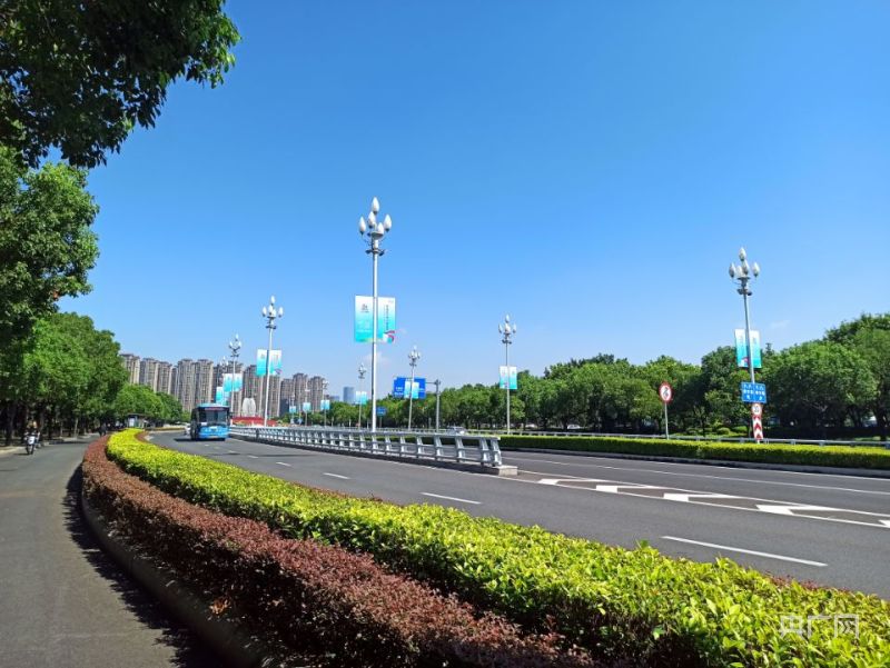 道路兩側(cè)以峰會(huì)為主題的道旗迎風(fēng)而立(央廣網(wǎng)記者 羅曉英 攝)