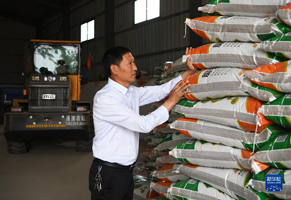 在河南省南陽市唐河縣湖陽鎮(zhèn)張灣村,種糧大戶趙建成在整理倉庫里的化肥,準備夏收之后的夏種(2022年5月26日攝)。新華社記者 張浩然 攝