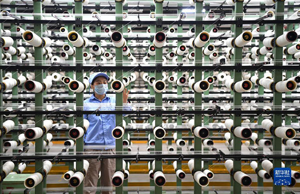 中國平煤神馬集團平頂山神馬簾子布發(fā)展有限公司的員工在查看尼龍絲道(2019年3月20日攝)新華社記者 李嘉南 攝
