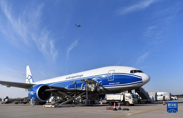鄭州新鄭國際機場工作人員在為一架俄羅斯空橋貨運航空公司貨機裝貨(2021年12月30日)。新華社記者 李嘉南 攝