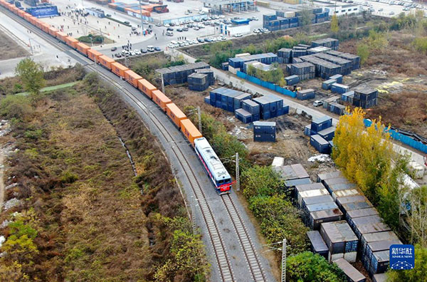 中國鄭州至芬蘭赫爾辛基的中歐班列駛出中國鐵路鄭州局集團有限公司圃田車站(2020年11月20日,無人機照片)。新華社記者 郝源 攝
