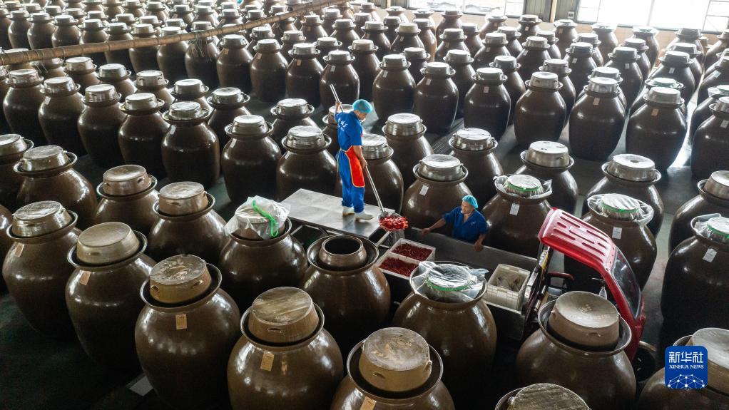 位于四川省眉山市的四川老壇子食品有限公司的工人在撈取已經(jīng)腌制好的泡菜(2022年6月24日攝,無人機(jī)照片)。新華社記者 沈伯韓 攝