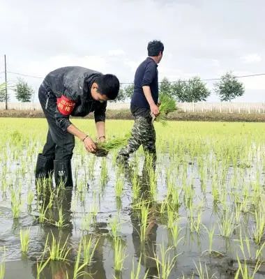 圖為6月6日,黑龍江省大慶市肇源縣肇源鎮(zhèn)四方山村網(wǎng)格員幫助殘疾戶補(bǔ)插秧苗。 李友亮 攝