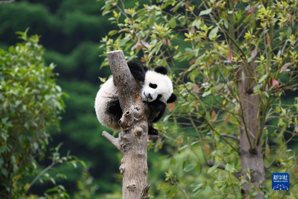 在中國大熊貓保護研究中心臥龍神樹坪基地內(nèi),一只大熊貓在樹上休息(2022年4月24日攝)。 新華社記者 胥冰潔 攝