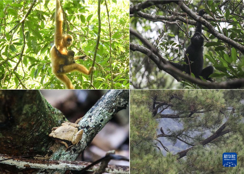 拼版照片:左上圖為2021年5月拍攝的海南長臂猿B群幼猿(海南熱帶雨林國家公園管理局供圖);右上圖為在海南熱帶雨林國家公園體制試點區(qū)霸王嶺自然保護區(qū)內(nèi)拍攝的海南長臂猿(2019年10月25日新華社記者蒲曉旭攝);左下圖為在霸王嶺自然保護區(qū)內(nèi)拍攝的姬蛙(2019年10月26日新華社記者蒲曉旭攝);右下圖為在霸王嶺自然保護區(qū)內(nèi)拍攝的蛇雕(2019年10月26日新華社記者蒲曉旭攝)。 新華社發(fā)