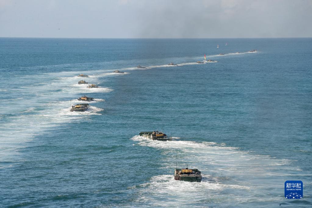 陸軍第74集團(tuán)軍某合成旅兩棲裝甲車(chē)進(jìn)行海上泛水編波訓(xùn)練(2020年8月14日攝)。新華社發(fā)(李彬 攝)