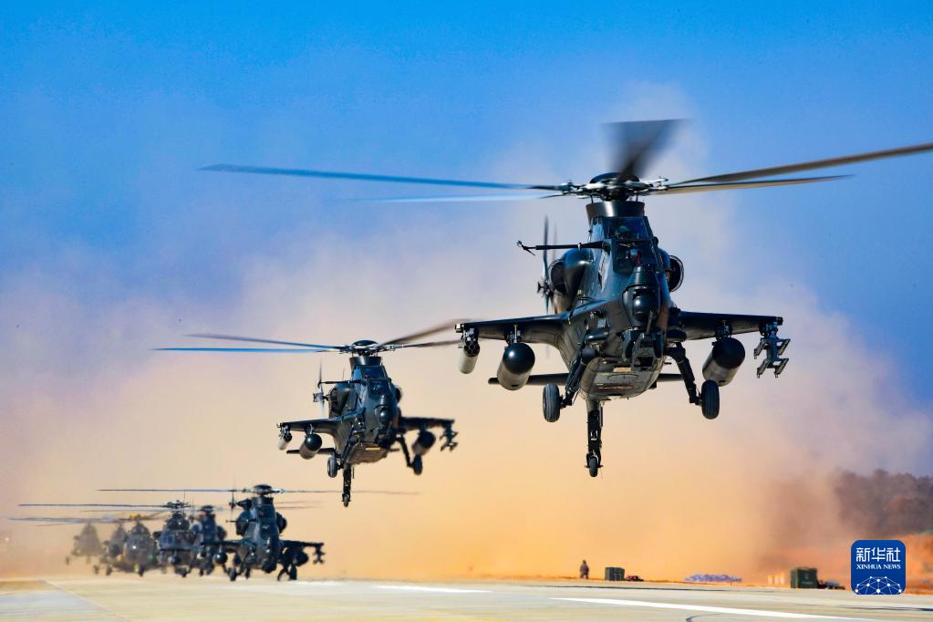 陸軍第73集團(tuán)軍某陸航旅組織飛行訓(xùn)練,戰(zhàn)機(jī)編隊(duì)依次起飛(2021年4月22日攝)。新華社發(fā)(李士龍 攝)
