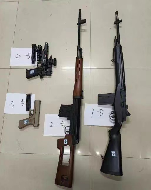 民警經(jīng)過(guò)細(xì)致研判及摸排走訪,最終鎖定犯罪嫌疑人為趙某某,并在鐵西區(qū)興順街南十二路附近某小區(qū)將其抓獲,當(dāng)場(chǎng)查獲仿真槍4支。后經(jīng)鑒定,其中2支以氣體為發(fā)射動(dòng)力,認(rèn)定為槍支。
